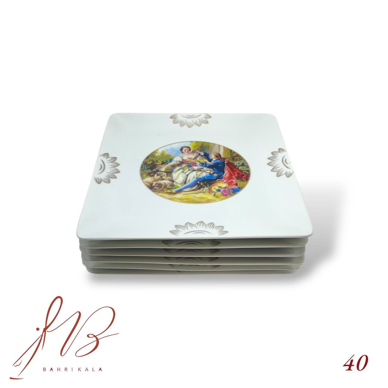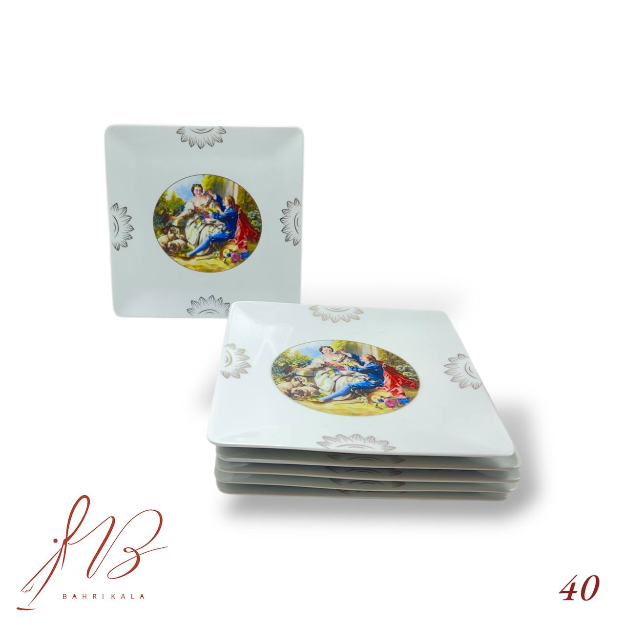 پیش دستی مربعی چینی آتاسای طرح لیلی مجنون کد ۴۰. ابعاد ۱۹ در ۱۹ سانتی‌متر. انتخابی شیک و اصیل برای سرو کیک، میوه و دسر.