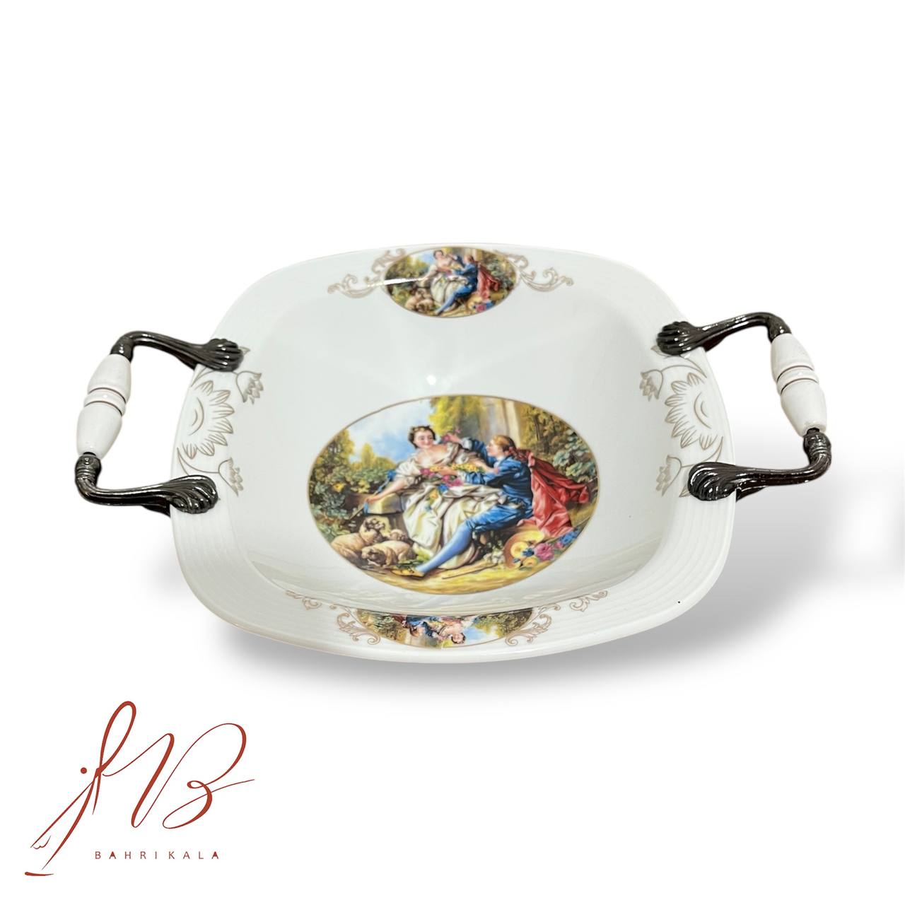 کاسه مربعی دستهدار آتاسای طرح لیلی مجنون کد ۳۴. جنس چینی درجه یک با ابعاد ۳۳ در ۲۵ سانتیمتر. بهترین انتخاب برای آجیل خوری مجلسی، سالاد و استفاده دکوراتیو.